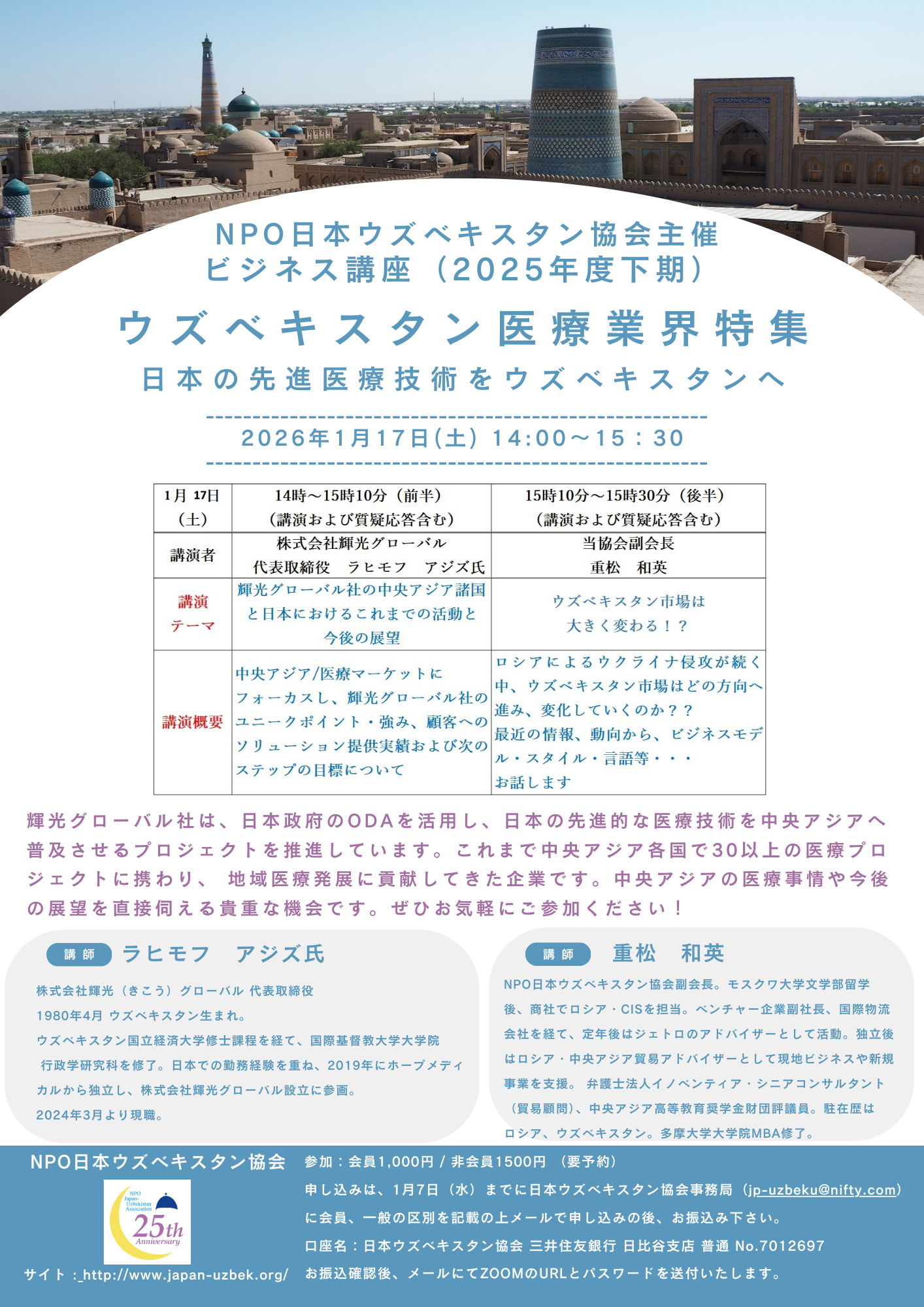 今回は羽鳥隆・前ウズベキスタン大使をお迎えします。また当日は、駒崎万集さんの美しいドウタール演奏と歌、舞踏団グリスタンの華やかなウズベクダンスが新しい年の幕開けを彩ります。
